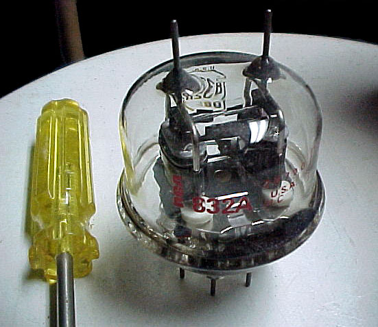 | 832A | Unknown | This nice clear shot shows the intricate construction inside this weirdly shaped little tube. The screwdriver is for size comparison. |
