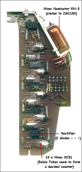 | 1965 Counter & Display | Peter H. Wendt | This bizarre-looking card is most likely from a vacuum tube calculator. Picture a big hand calculator, then scale it up maybe 8 times, to the approximate size (and shape) of a small audio mixing board! The circuit card appears British, made by the Bell Punch Board Company, and it was secured vertically beneath an inclined panel. The display used several of these, mounted side by side like the adapter boards in a PC. The tube here is a Hivac XN3 "Numicator" Nixie tube driven by a decimal counter based on 10 Hivac XC31 relay tubes. |