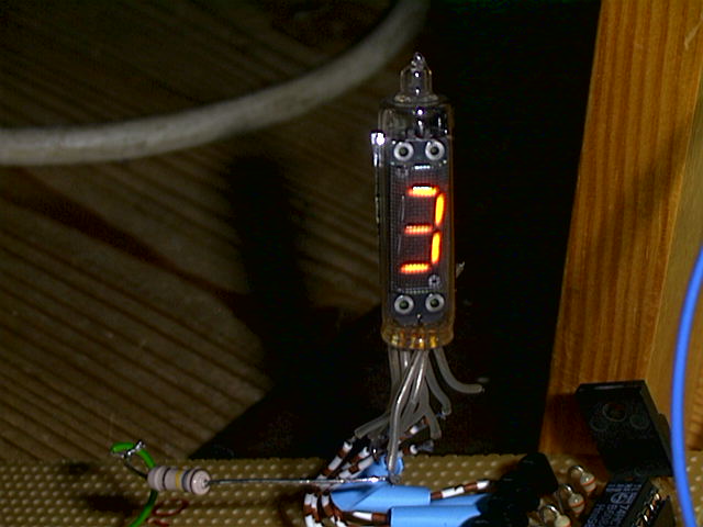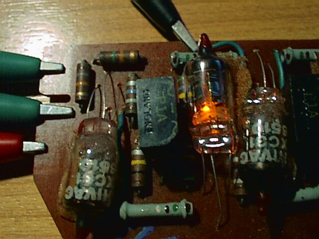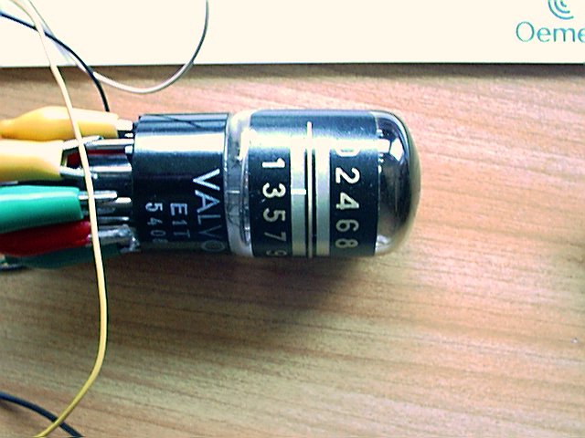 | Small Display Tube | Kainz Simon | Before LED and LCD displays, tubes displayed glowing numbers by energizing the appropriate segments. Small ones had spaghetti-like leads which were soldered into the circuit, as we see here. |