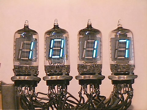 | Four Nixie tubes | Brian M. Phelps | Miniature "Nixie" tubes were used to display numbers, first with 10 or 11 glowing filaments (cathodes) and a common anode, then, as in this example from a digital clock, with segmented displays. |
