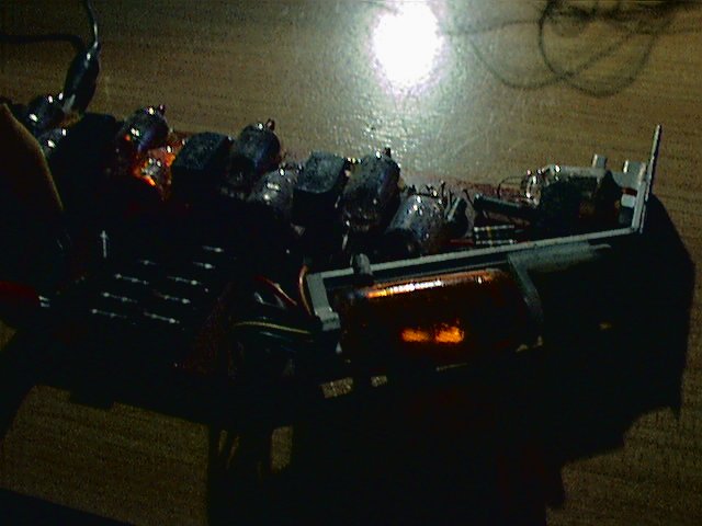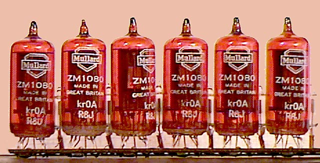 | Six Nixie tubes | Brian M. Phelps | Cool-looking Mullard Nixies with a red coating for readability. Originally a bank of seven tubes, half of a 14-digit numerical display. |