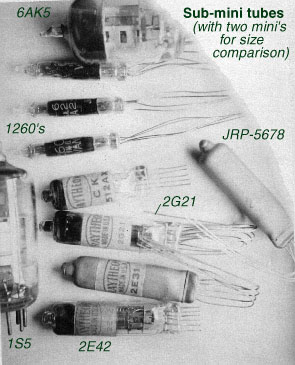 | Sub-mini tubes | Robert Casey (WA2ISE) | Neon lamp-sized tubes once used in battery portable radios and hearing aids. Two tubes of standard "miniature" size are top and bottom for comparison. |