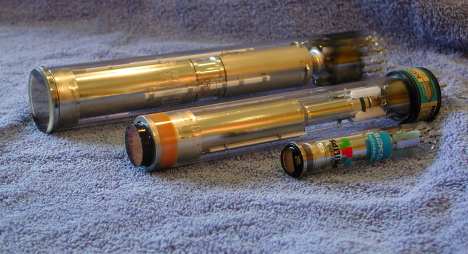 Peter writes: "Before CCD imagers, TV cameras used special tubes to convert images to video signals. The last tube design (1980s) was 18mm diameter, shown here next to it's 25mm diameter (1970s) predecessor and a very large 30mm tube of the 1960s, when RCA (and the USA) thought 'bigger was better'." |