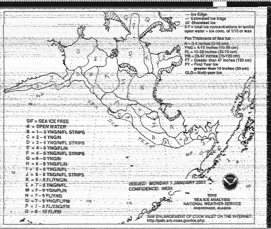 Ice chart from the US National Weather Service in Anchorage, Alaska, sent via NOJ, Kodiak. The area shown is for the coast of Alaska north of the Aleutians. Note that the ice boundaries are apparently hand drawn.